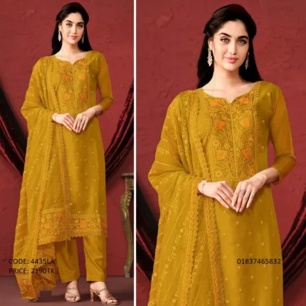 SKU:4435LA Kamiz: Georgette, Embroidery Work. Ornaa: Pure Shifon. Salwar: Santoon. Type: Made in Bangladesh. Call For order: 01971816287 01910063133 Bkash Payment: 01910063133 Whatsapp , Viber : 01971816287 Imo : 01993221985