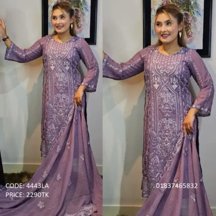 SKU:4443LA Kamiz: Georgette, Embroidery Work. Ornaa: Pure Shifon. Salwar: Santoon. Type: Made in Bangladesh. Call For order: 01971816287 01910063133 Bkash Payment: 01910063133 Whatsapp , Viber : 01971816287 Imo : 01993221985
