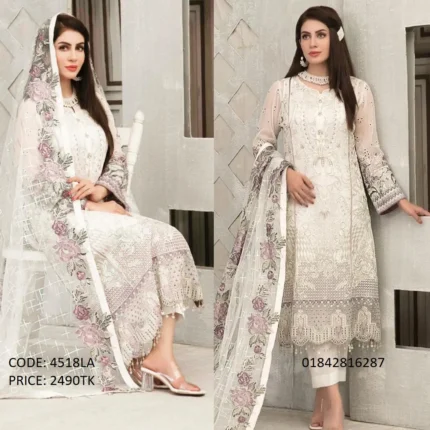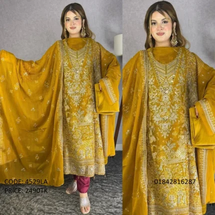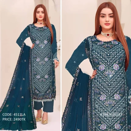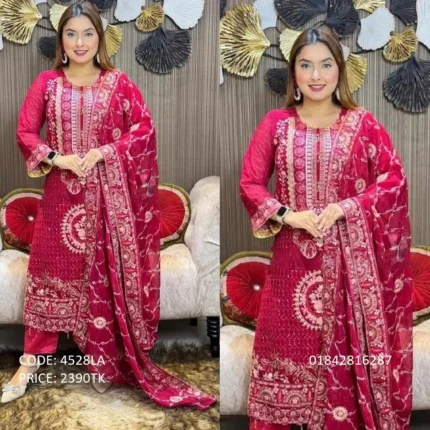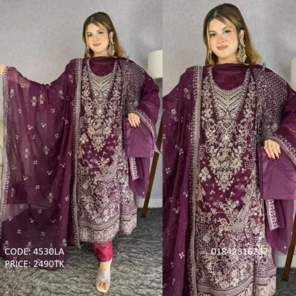 .Code:4555LA .Body: Soft Georgette .Design Work: Heavy Embroidery .Sleeve: Soft Georgette .Dupatta: Chiffon .Salwar & Inner: Santoon .Semi –Stitched .Type: Made in Bangladesh Call for order : 01774263140 01631493054