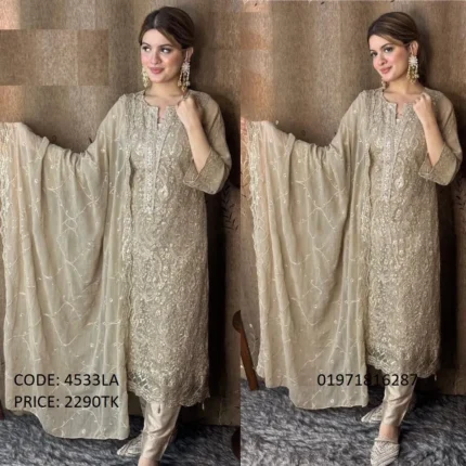 Code:4533LA Price:2290Tk Material: Embroidered Net Work Details: Embroidery Work Dupatta: Embroidered Organza Dupatta 2.75 yards Salwar: Jamawar Trouser 3yard Type: Made in Bangladesh Call for order : 01771006910 01631493054